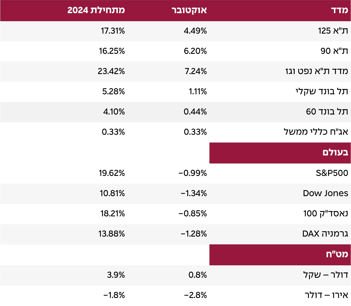 פרמיית הסיכון של ישראל (ל-5 שנים) ירדה בחודש אוקטובר, לראשונה מאז יולי, מרמה של 159.5 בשיא ל-139.7. הביטחון הגובר השתקף גם בשוק המניות המקומי, כשמדד ת"א 125 זינק ב-4.5% עקף את ביצועי כמעט כל מדדי המניות בעולם, השלים מתחילת השנה עליה של 17.3% והתקרב בתשואה השנתית למדד ה-S&P500 , שעלה ב-20.1%.