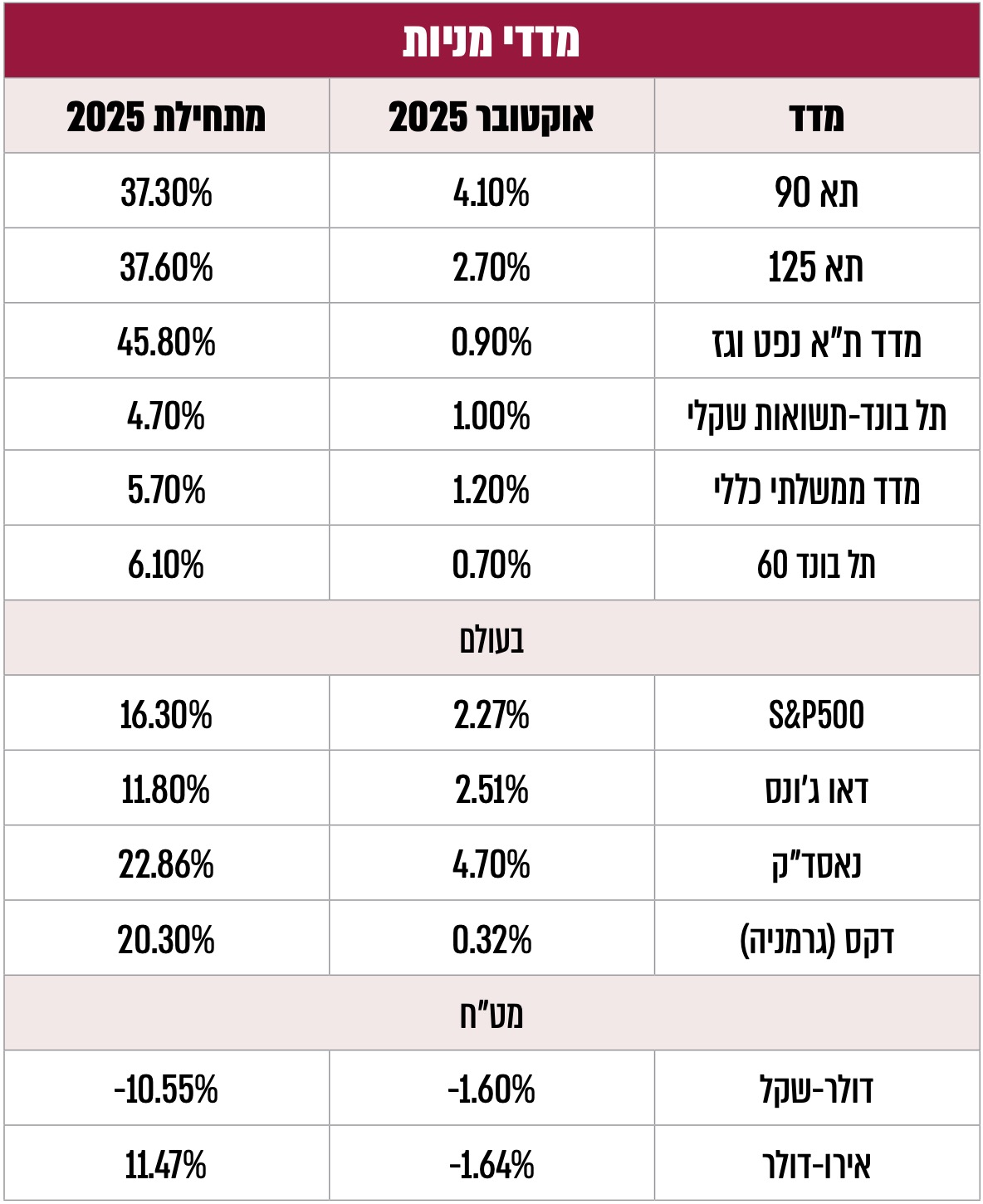 למרות השבתת הממשל בתחילת החודש, אוקטובר לא היה חודש שבו נתוני המאקרו המסורתיים נעלמו, הוא היה החודש שבו הם הפכו לפחות רלוונטיים עבור רוב הנרטיב הכלכלי. האינפלציה והריבית פחות עניינו את המשקיעים מהוצאות על השקעות בתחום ה-AI. בעידן שבו טכנולוגיה מייצרת את הכלכלה, קצב בניית התשתיות ל-AI החל להיתפס כנתון המאקרו החשוב ביותר. אלא שבאותה מהירות והתלהבות בה הנרטיב הזה נבנה והסנטימנט התבסס, יחד עם הריכוזיות שלו והמנגנון הסיבובי של השקעות צולבות, אלה גם עלולים להתהפך. מבחינת המשקיע הבודד, המסקנה היא להמשיך לגלוש על גל ה-AI ועל הערך העצום שהוא מציע לכלכלה ולאנושות, אך יחד עם זאת לשמור גם רגל אחת על הקרקע, עם החזקות בנכסים ריאליים כמו נדל"ן, בחברות של הכלכלה הישנה, באגרות חוב בטוחות של ממשלות ובשורה התחתונה – פיזור.