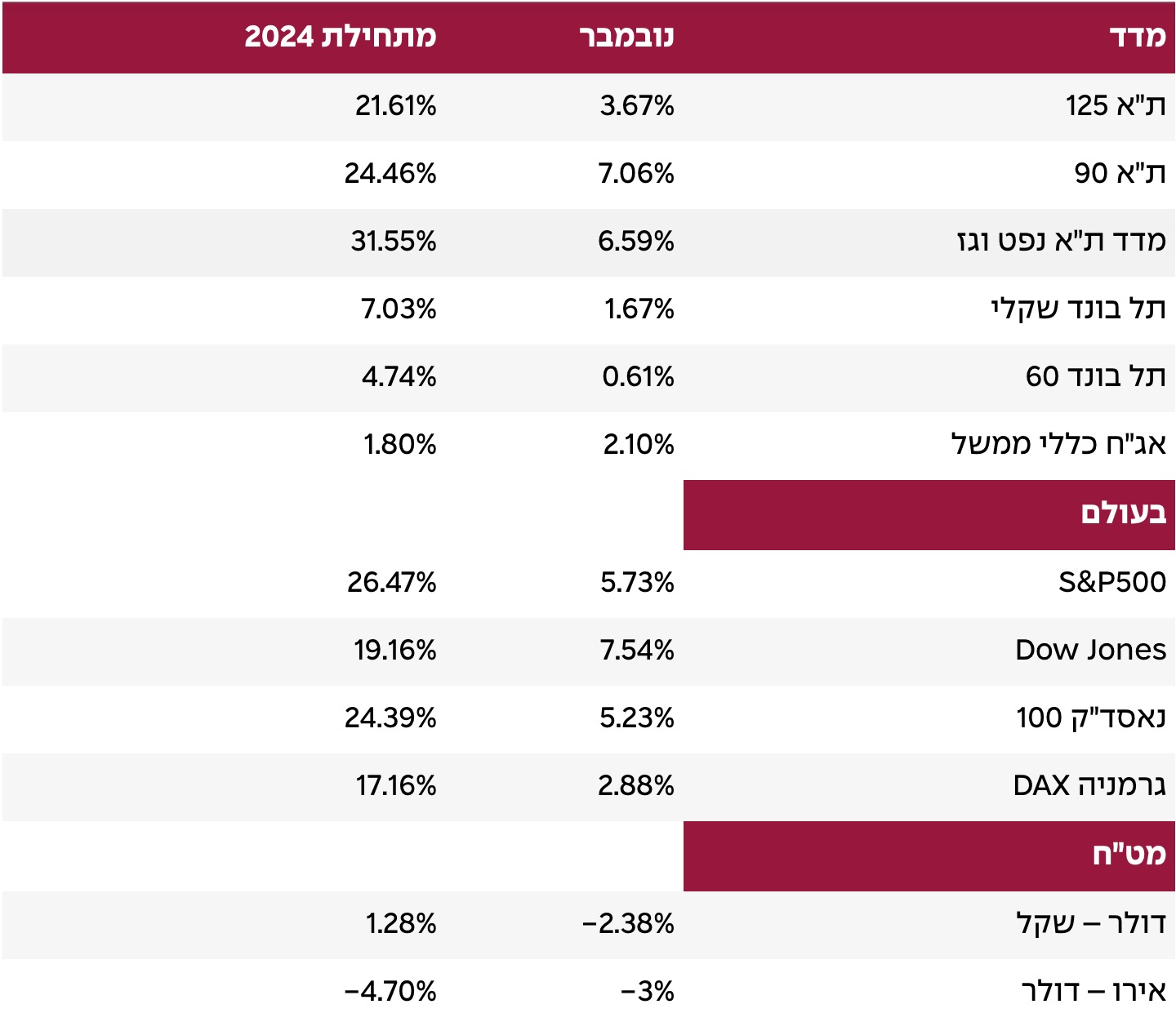 שוקי ההון המשיכו לעלות בחודש נובמבר על רקע הפחתת ריבית נוספת של הבנק הפדרלי (הפד), והמשך תמחור הבחירה בטראמפ. המדדים הגדולים לא הסתפקו רק בשבירת שיאים חדשים אלא גם עשו זאת בקצב המהיר ביותר (מתחילת השנה) בהשוואה לכל שנה אחרת במאה הזאת. אך ככל שתמחור טראמפ הולך ומסתיים כך השוק עשוי לחזור ולהיסחר לאור ההתפתחויות הכלכליות השוטפות.