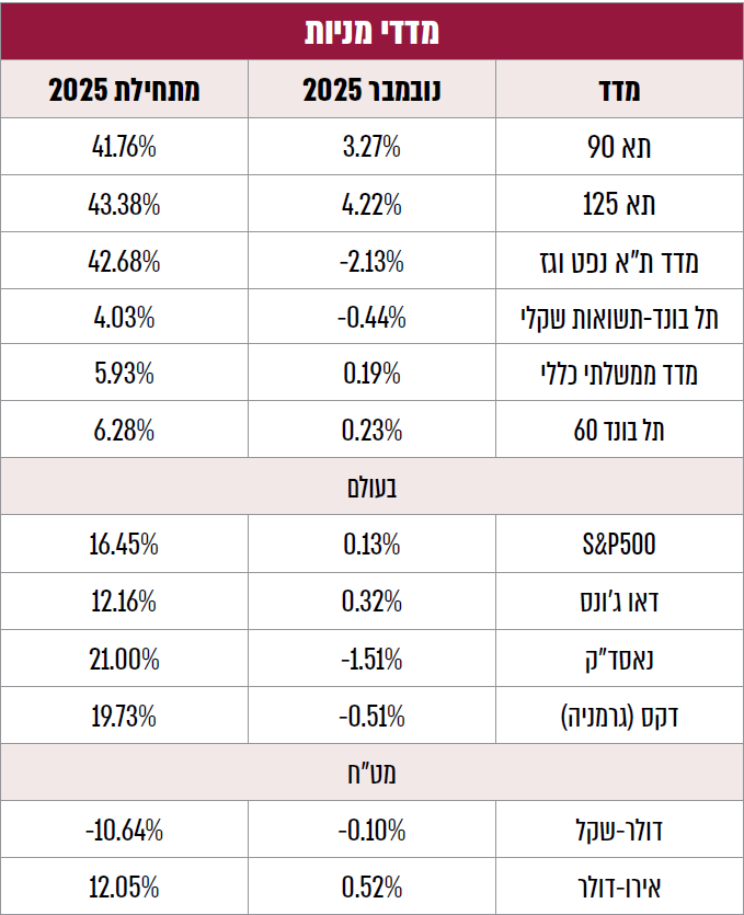 הפיצול בין ביצועי החברות הותיר את שוק המניות האמריקאי לדשדש בנובמבר, ה-S&P500 נותר כמעט ללא שינוי (0.1%) ומדד הנאסד"ק, שמשקף בעיקר חברות טכנולוגיה, אף ירד ב-1.5%. הירידה הזאת בולטת יותר לאור הפחתת הריבית של הפד, ב-29 באוקטובר, שנחשבת ככוח תומך לשוק, ובמיוחד למניות הטכנולוגיה הרגישות לריבית, וגם בהתחשב בציפיות להפחתת ריבית נוספת בהחלטת הריבית הבאה ב-10 בדצמבר (ל-3.75%).